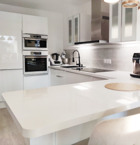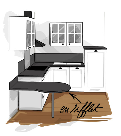 Si vous choisissez l’option avec un angle, vous pouvez intégrer un sifflet ou une desserte. Il s’agit d’une forme arrondie à l’extrémité de votre plan de travail. Grâce à cette option, non seulement vous disposez d’un espace supplémentaire pour cuisiner ou pour vos appareils électroménager mais il vous suffit également d’ajouter des chaises autour de cette extension pour en faire une petite table de cuisine !